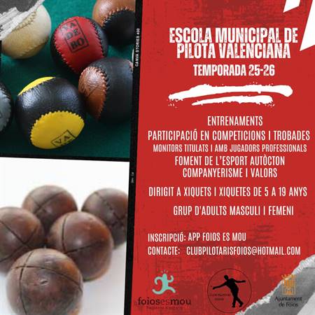 L'Escola Municipal de Pilota Valenciana de Foios és un espai dedicat a l’ensenyament i la pràctica del nostre esport tradicional. Adreçada a xiquets i xiquetes de 5 a 19 anys, així com a persones adultes, ofereix entrenaments gratuïts amb monitors qualificats i jugadors professionals. A més de la formació esportiva, es promouen valors com el companyerisme, l’esforç i el respecte, tot fomentant la cultura i l’esport autòcton valencià.