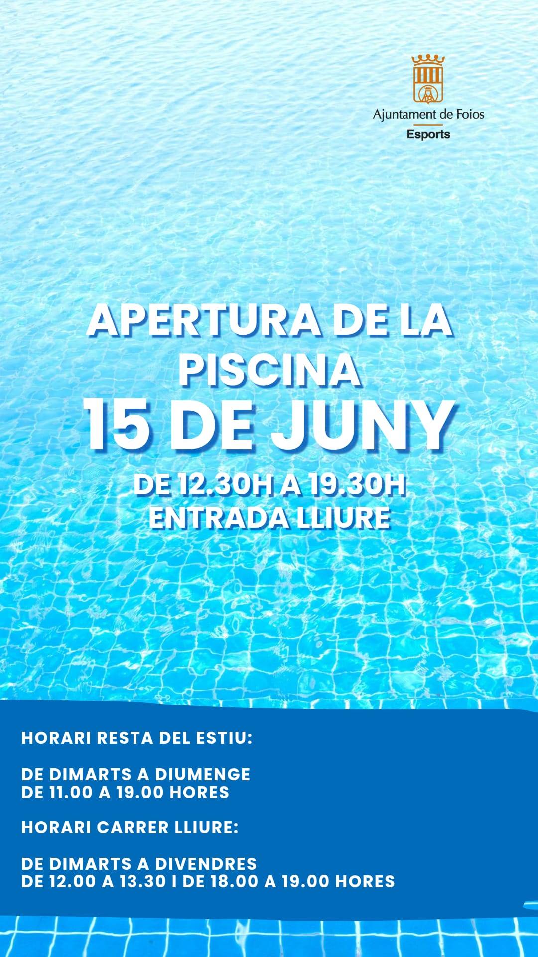 La piscina municipal de Foios obrirá al públic el pròxim diumenge, 15 de juny a les 12:30 fins les 19:30h i eixe dia serà accés lliure.
