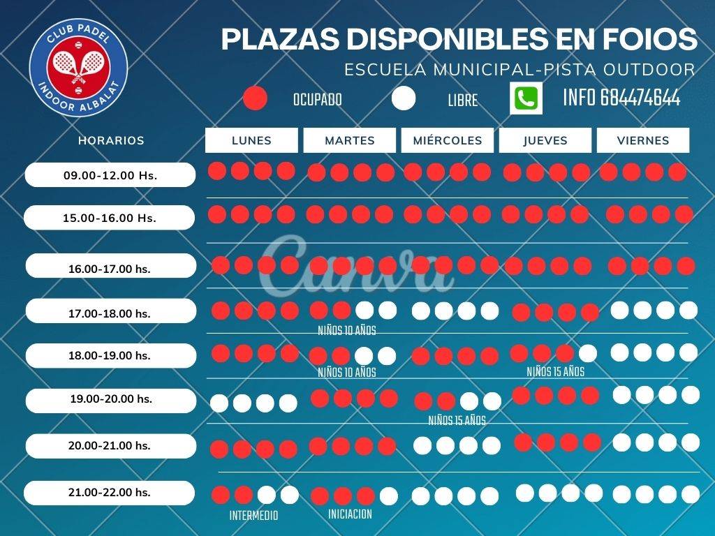 El Club Pádel Foios dispone de plazas disponibles en sus clases de pádel. Si te interesa iniciarte o mejorar tu nivel, consulta la disponibilidad según tu categoría y reserva tu plaza. Las sesiones se imparten en las instalaciones del Polideportivo de Foios, en un ambiente cercano y profesional.